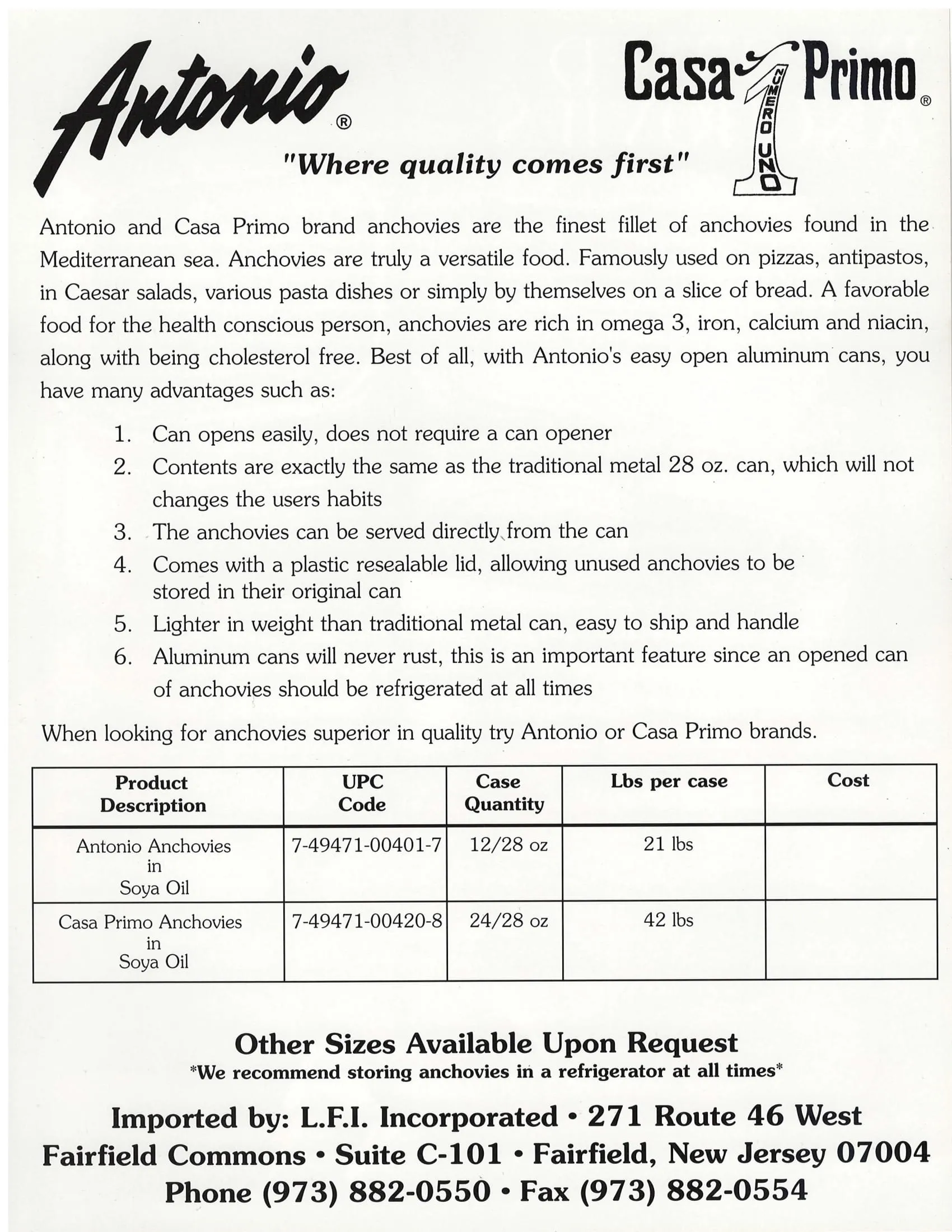 Antonio and Casa Primo brand anchovies are the finest fillet of anchovies found in the Mediterranean sea. Anchovies are truly a versatile food. Famously used on pizzas, antipastos, in Caesar salads, various pasta dishes or simply by themselves on a slice of bread. A favorable food for the health conscious person, anchovies are rich in omega 3, iron, calcium and niacin, along with being cholesterol free. Best of all, with Antonio’s easy open aluminum cans, you have many advantages such as: