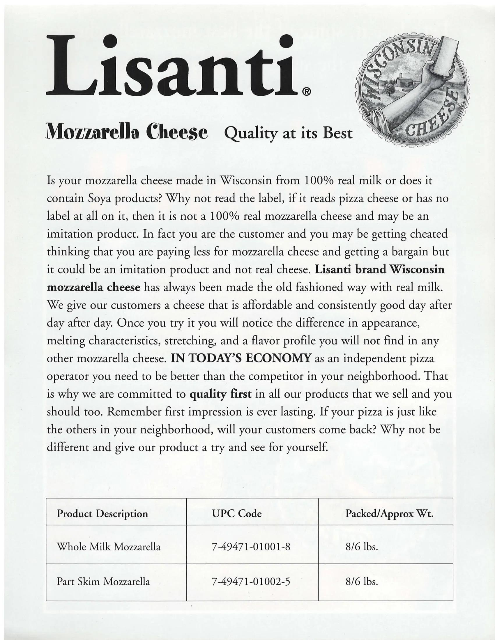 Is your mozzarella cheese made in Wisconsin from 100% real milk or does it contain Soya products? Why not read the label, if it reads pizza cheese or has no label at all on it, then it is not a 100% real mozzarella cheese and may be an imitation product. In fact you are the customer and you may be getting cheated thinking that you are paying less for mozzarella cheese and getting a bargain but it could be an imitation product and not real cheese. Lisanti brand Wisconsin mozzarella cheese has always been made the old fashioned way with real milk. We give our customers a cheese that is affordable and consistently good day after day after day. Once you try it you will notice the difference in appearance, melting characteristics, stretching, and a flavor profile you will not find in any other mozzarella cheese. IN TODAY’S ECONOMY as an independent pizza operator you need to be better than the competitor in your neighborhood. That is why we are committed to quality first in all our products that we sell and you should too. Remember first impression is ever lasting. If your pizza is just like the others in your neighborhood, will your customers come back? Why not be different and give our product a try and see for yourself.