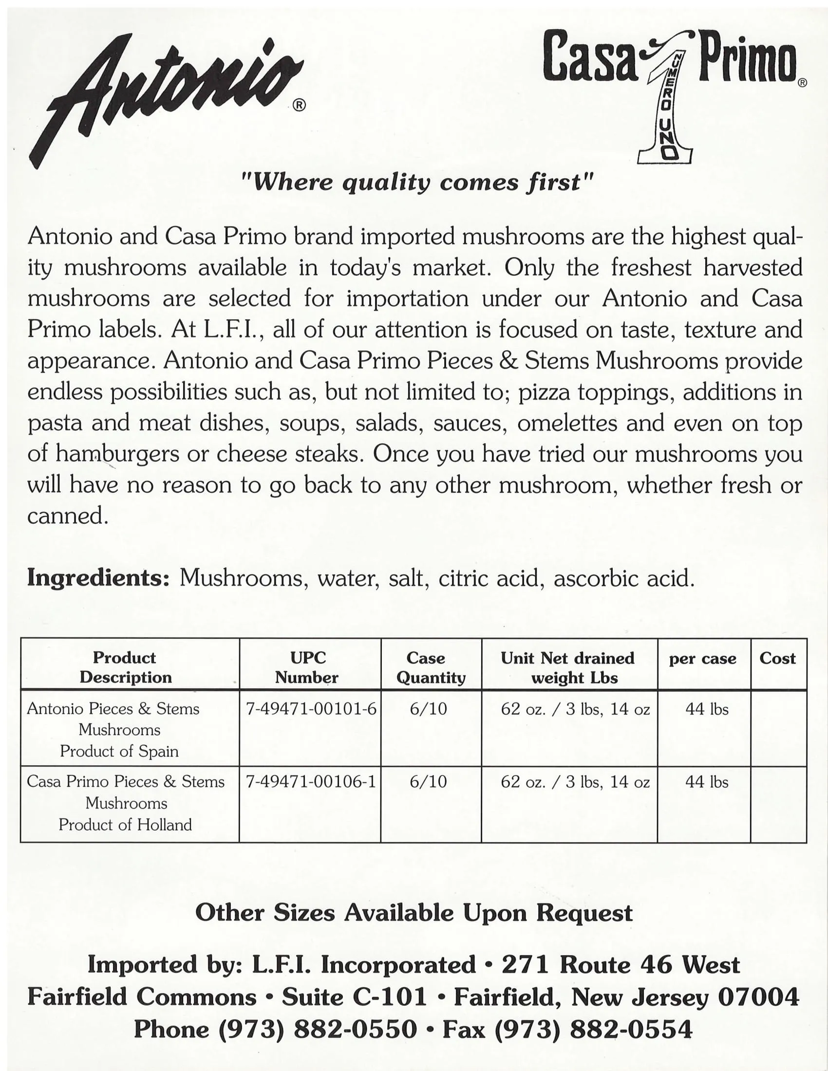Antonio and Casa Primo brand imported mushrooms are the highest qual- ity mushrooms available in today’s market. Only the freshest harvested mushrooms are selected for importation under our Antonio and Casa Primo labels. At L.F.I., all of our attention is focused on taste, texture and appearance. Antonio and Casa Primo Pieces & Stems Mushrooms provide endless possibilities such as, but not limited to; pizza toppings, additions in pasta and meat dishes, soups, salads, sauces, omelettes and even on top of hamburgers or cheese steaks. Once you have tried our mushrooms you will have no reason to go back to any other mushroom, whether fresh or canned.