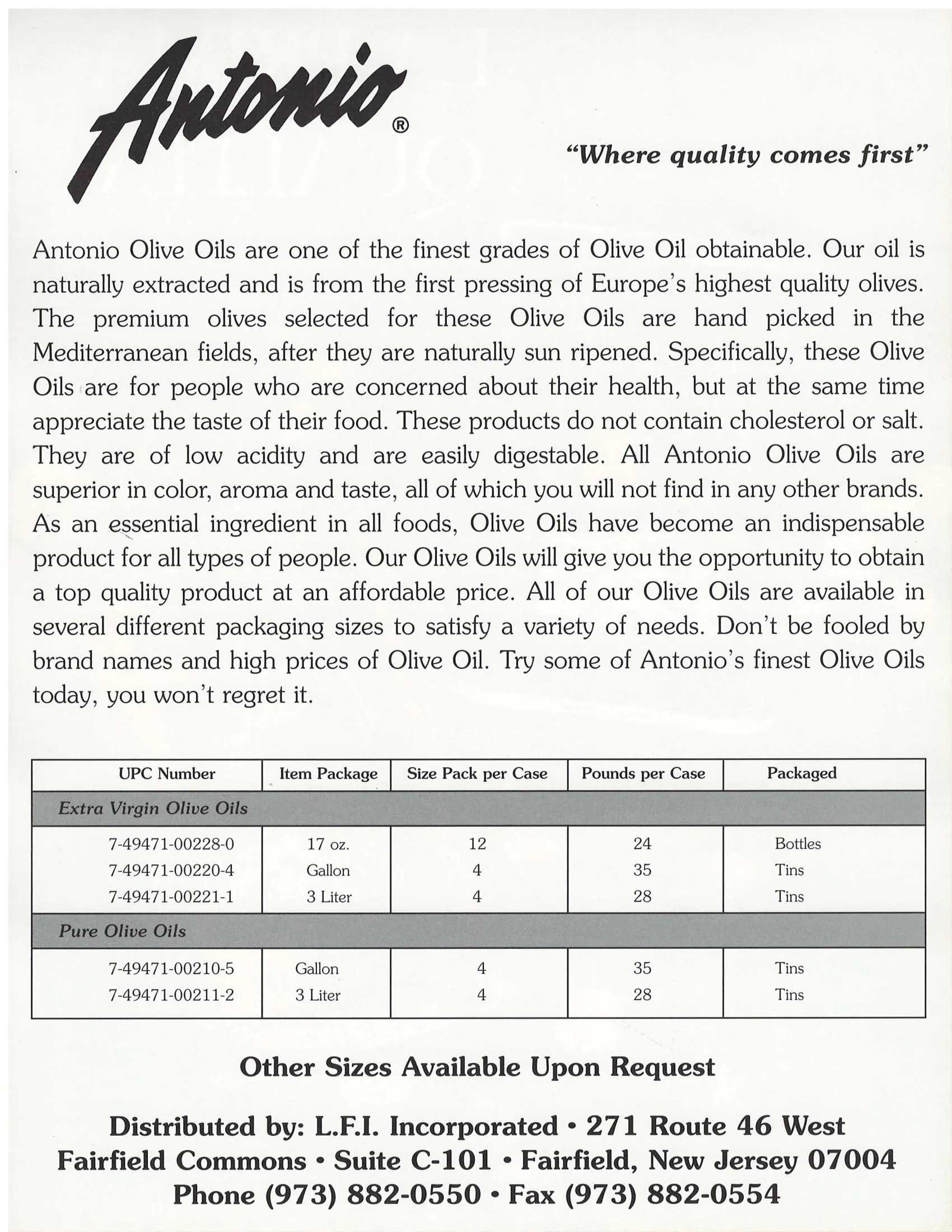 LFI’s Oils are some of the finest grades of Oil obtainable. Our oil is naturally extracted and is from the first pressing of the highest quality olives. The premium olives selected for these Olive Oils are hand picked after they are naturally sun ripened. Specifically, these Olive Oils are for people who are concerned about their health, but at the same time appreciate the taste of their food. These products do not contain cholesterol or salt. They are of low acidity and are easily digestible. Our Antonio Olive Oil is superior in color, aroma and taste, all of which you will not find in any other brands. As an essential ingredient in all foods, Olive Oils have become an indispensable product for all types of people. Our Olive Oils will give you the opportunity to obtain a top quality product at an affordable price. All of our Olive Oils are available in several different packaging sizes to satisfy a variety of needs. Don’t be fooled by brand names and high prices of Olive Oil. Try some of LFI’s finest Oils today, you won’t regret it!